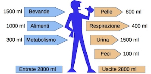 Nelle “uscite” si intende invece la perdita di acqua che avviene con l’urina, le feci, i polmoni e la cute (sudore).