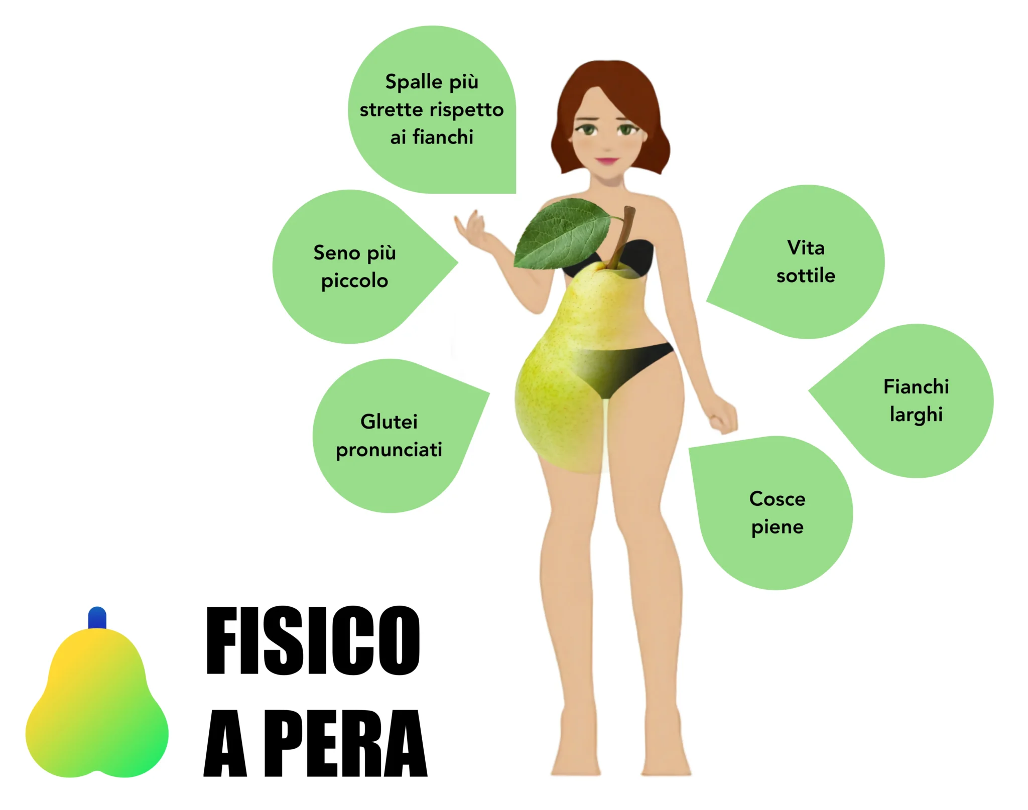Innanzitutto definiamo con chiarezza quali sono le caratteristiche che presenta una donna (o un uomo) che ha un fisico a forma di pera, cosi da poter essere in grado da sola di riconoscerlo con certezza. Un fisico a forma di pera si contraddistingue generalmente soprattutto per due caratteristiche: