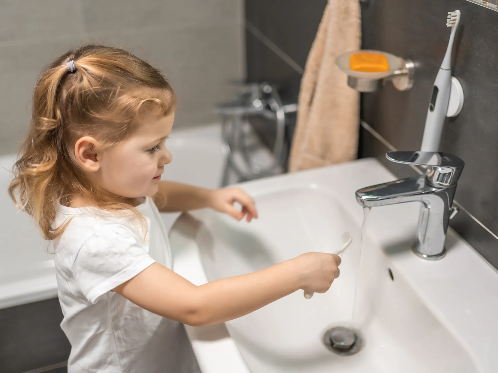 bambina che lava i denti, importanza dell'igiene dentale per alimentazione di infanziaOccorre prendersi cura dei denti lavandoli almeno due volte al giorno. Gli alimenti ricchi di amidi o zuccheri, se consumati troppo spesso nell’arco della giornata, possono contribuire all’insorgenza di carie, gengiviti e altri problemi ai denti, quindi è meglio evitare di mangiucchiare e sorseggiare per tutto il giorno per l’alimentazione d’infanzia.