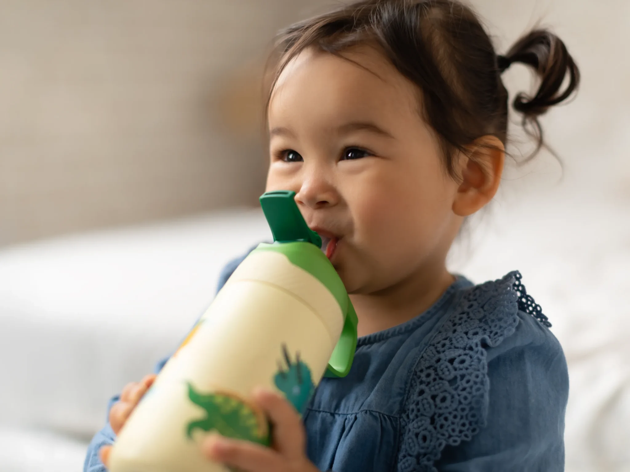 bambina che beve acqua dalla borraccia, spegnere la sete per l'alimentazione di infanziaConsumare acqua ma anche latte a basso contenuto di grassi e succhi di frutta naturali con moderazione.