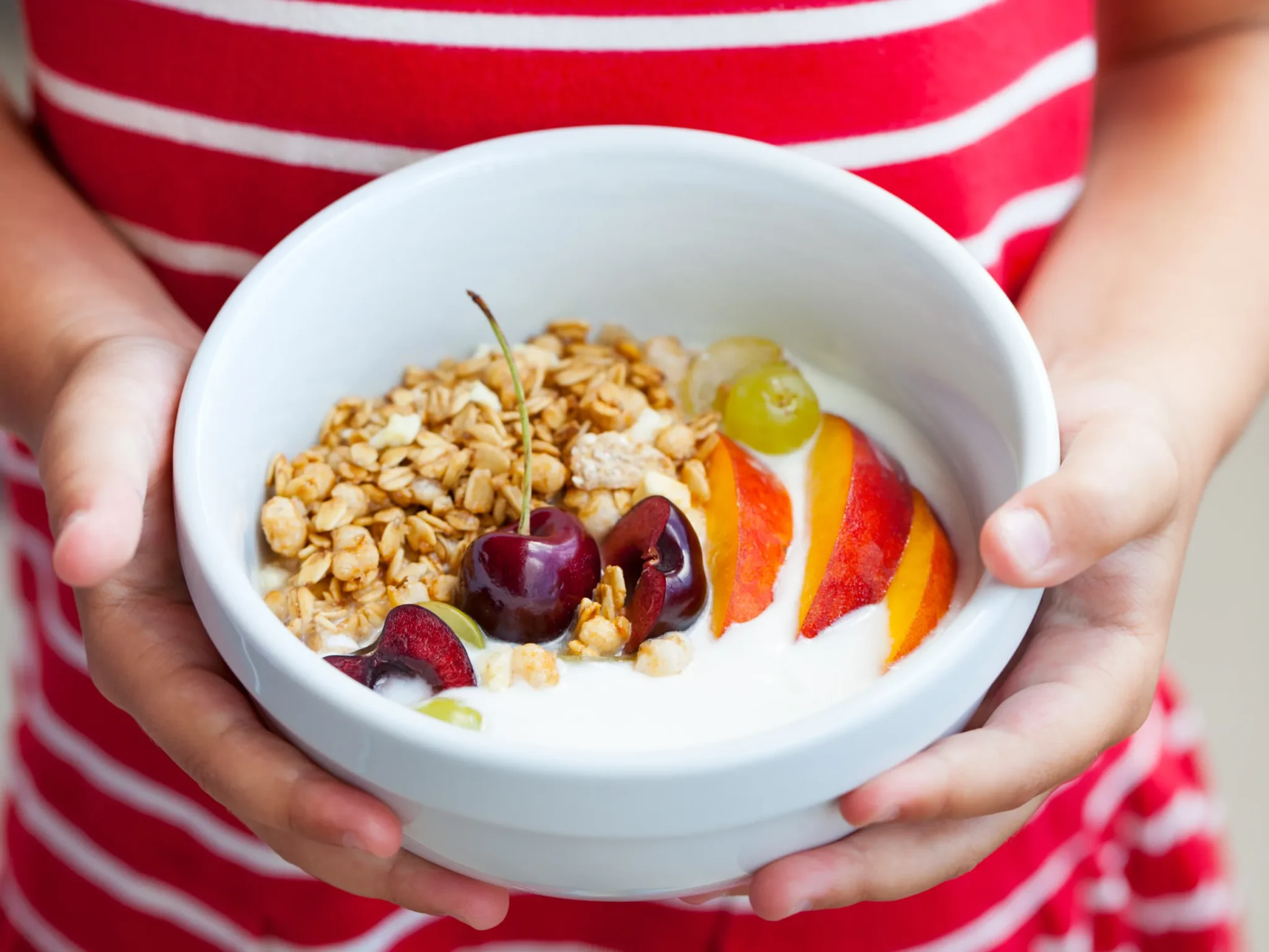 bambina che tiene una ciotola di yogurt con frutta e cereali,uno degli spuntini intelligenti per l'alimentazione di infanziaLe quantità e la tipologia della merenda nell’alimentazione di infanzia sono variabili a seconda dell’età e delle caratteristiche individuali del bambino. Ecco alcune idee: frullato di latte e frutta; pane con marmellata, miele o pomodoro; yogurt con o senza cereali; latte con biscotti secchi; macedonia; pane e cioccolato…